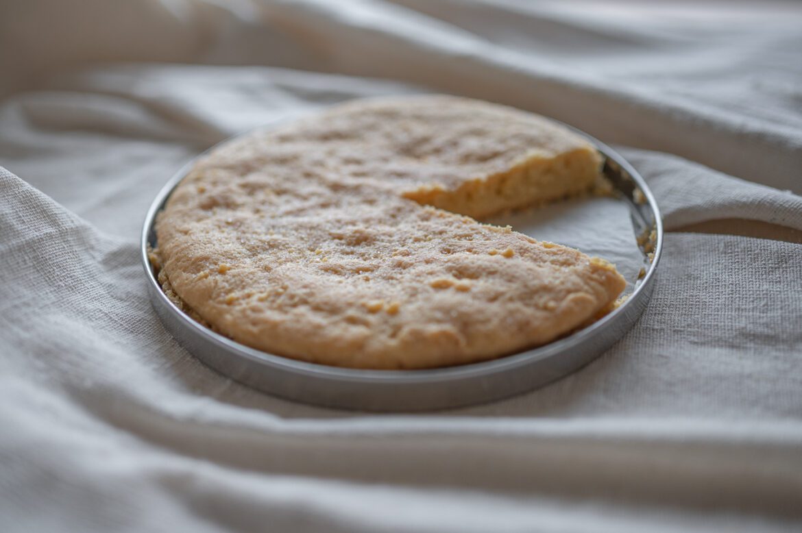 - 烤箱以攝氏 175 度預熱,將麵團桿成扁平狀,鋪放入塗抹了油的圓型烤盤中,表面塗上融化過後的奶油,放入烤箱烤 1 小時又 15 分鐘。