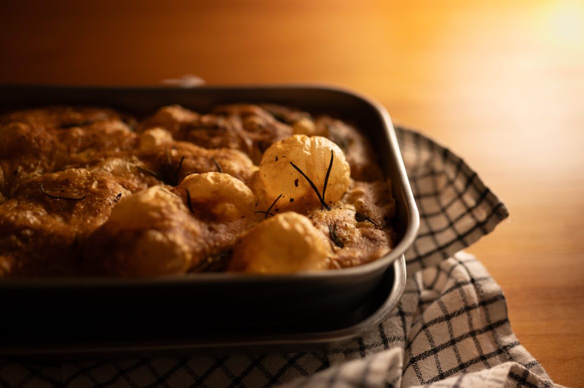 - 預熱烤箱至 230 度 C 。取出發酵好的麵團,麵團已漲大至模具大小,表面淋上橄欖油,放上迷迭香(為防烤焦,迷迭香先浸泡橄欖油)、海鹽及胡椒,接著用手指插入麵團製造氣泡,重複動作使氣泡均勻分佈。