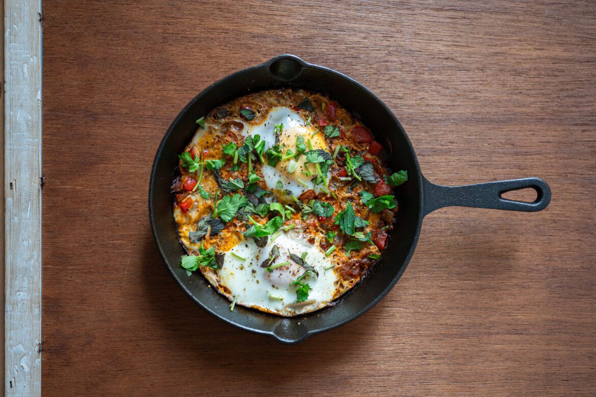 據猶太美食作家 Joan Nathan 的食譜書《King Solomon’s Table(所羅門王的餐桌)》中寫道,Shakshuka 是哥倫布大交換的產物,裡頭所使用的番茄、甜椒、辣椒皆來自新世界,落地歐洲大陸後逐世紀衍生出的融合料理,可能起源自鄂圖曼帝國時期。Shakshuka 盛行於北非和中東,為阿拉伯語「混在一起」的意思,時常作為早餐或早午餐食用。因爲一鍋到底的特性,是十分受歡迎的懶人料理。