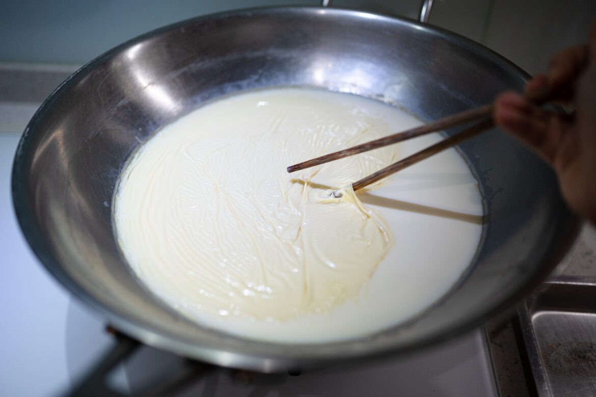 - 豆漿回鍋,加熱至冒煙但不滾的狀態,計時 6 分鐘,使表面結成豆皮。