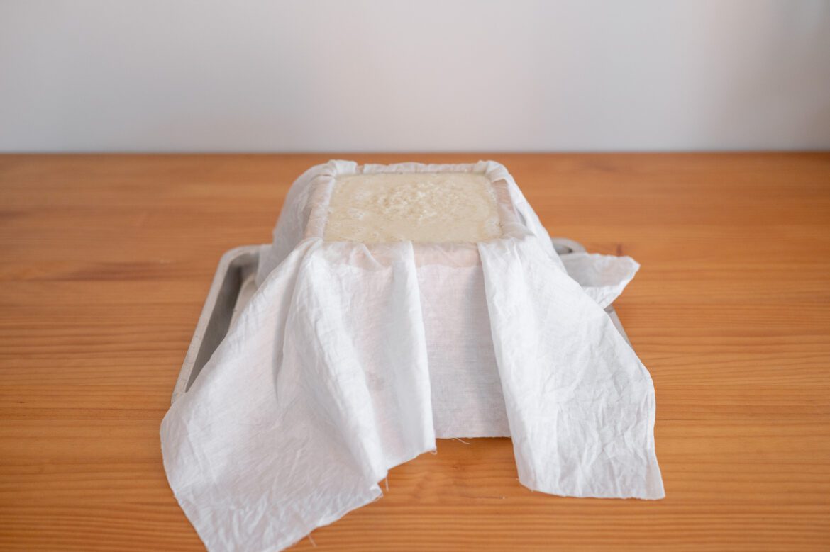 - 瀝水後掀開豆腐布觀察,若覺水份太多,可繼續覆蓋重物瀝水。